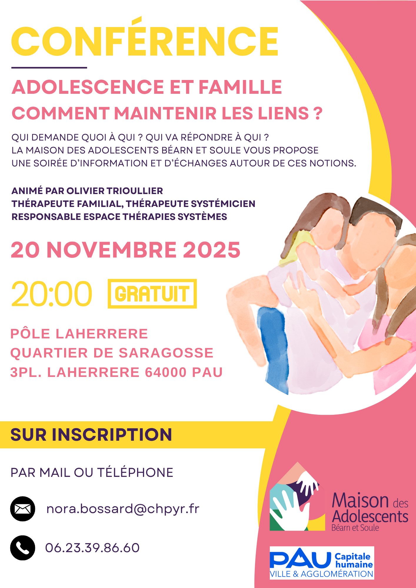 La Maison des Adolescents Béarn et Soule en collaboration avec la Communauté d’agglomération Pau Béarn Pyrénées, vous propose cette soirée d’information et d’échanges autour des sujets de l’adolescence et de la famille. Gratuit – sur inscription.